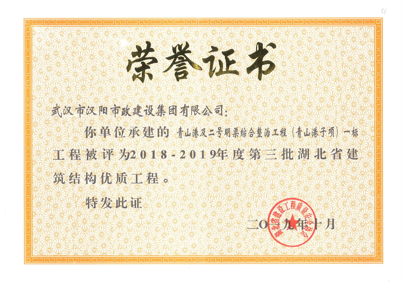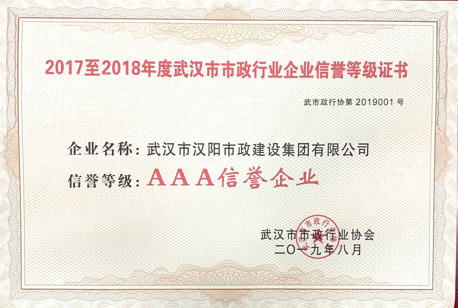武漢市市政行業企業信譽等級證書