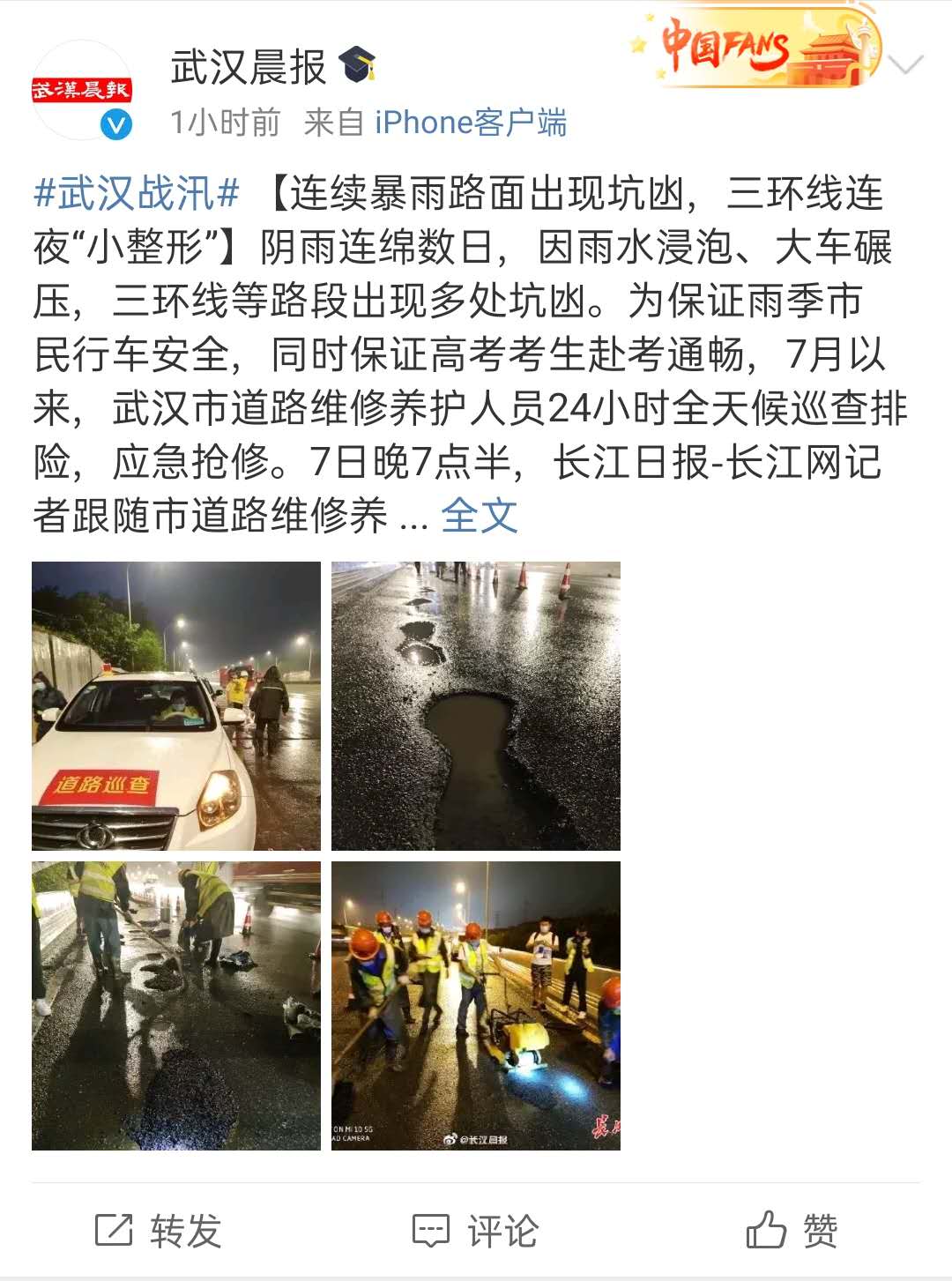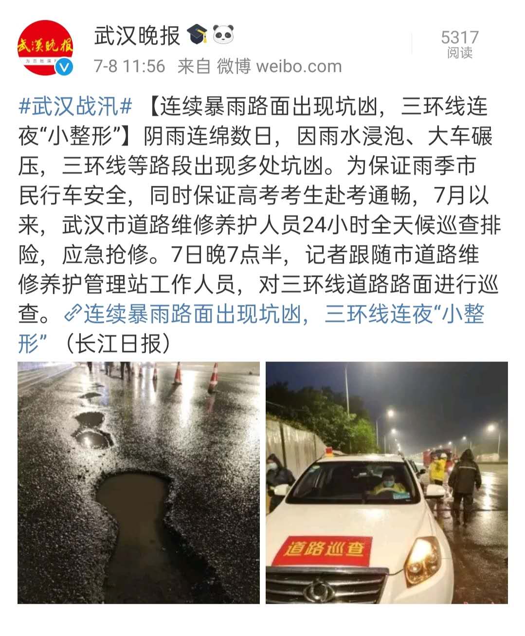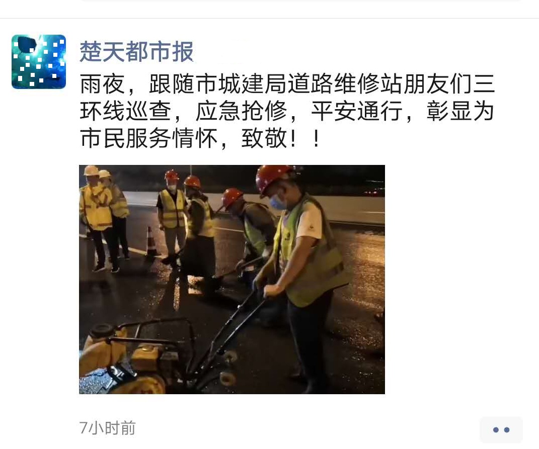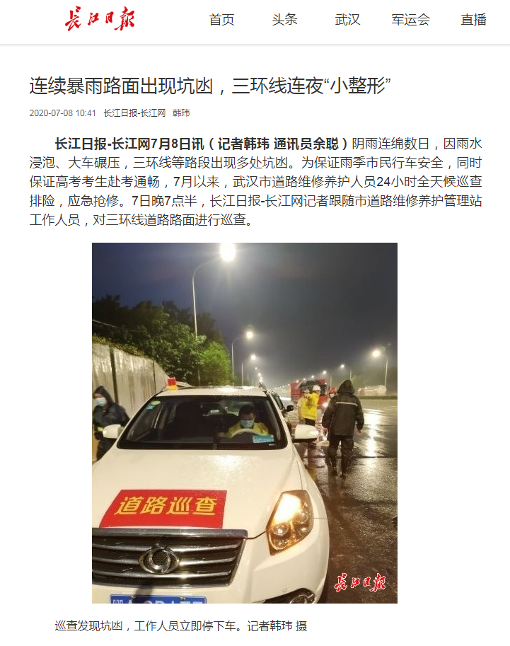 ? ? ? 近日,武漢市陰雨連綿,許多路段因雨水浸泡、車輛碾壓等出現(xiàn)坑凼,嚴重影響了交通安全。為保障雨季市民行車安全,助力高考考生赴考通暢,7月以來,漢陽市政六公司24小時全天候巡查排險,提前預防、提前搶修,積極修復受損路段,做到應急搶修不斷檔,獲得了民眾的一致好評,并被《長江日報》《武漢晨報》《武漢晚報》《楚天都市報》等主流媒體報道。
