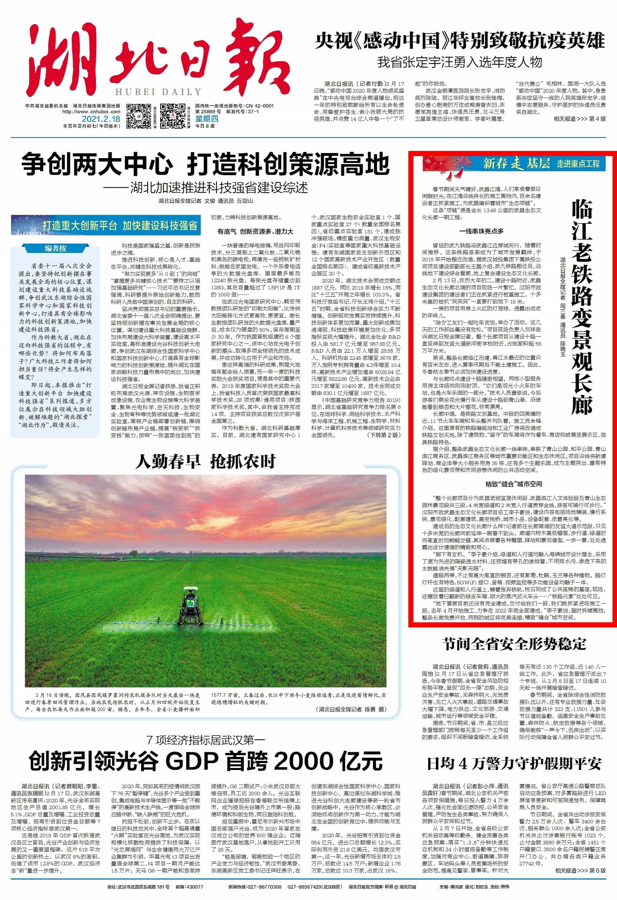 ? ? ? 2月18日,大年初七,新年后上班的第一個(gè)工作日,湖北日報(bào)頭版報(bào)道漢陽市政在建項(xiàng)目——武昌生態(tài)文化長廊施工進(jìn)展和工程亮點(diǎn),點(diǎn)贊漢陽市政建設(shè)者們利用春節(jié)假期搶抓工期,為武昌編織城市“生態(tài)項(xiàng)鏈”。