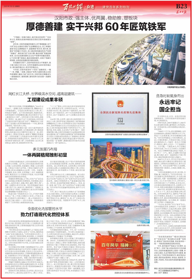 7月1日,長江日報專版報道漢陽市政,推出《厚德善建 實干興邦 60年匠筑鐵軍——漢陽市政:強主體、優兩翼、穩助推、塑板塊》專版報道,聚焦漢陽市政發展史,展現漢陽市政為城市發展做出的貢獻。