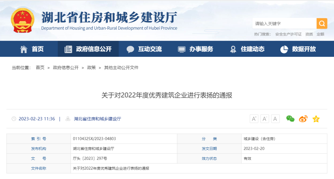 2月23日,湖北省住房和城鄉建設廳召開全省建筑業發展與管理工作會議,會上通報表揚26家突出貢獻企業和114家重要貢獻企業。漢陽市政榜上有名,獲評“湖北省2022年度重要貢獻建筑企業”。