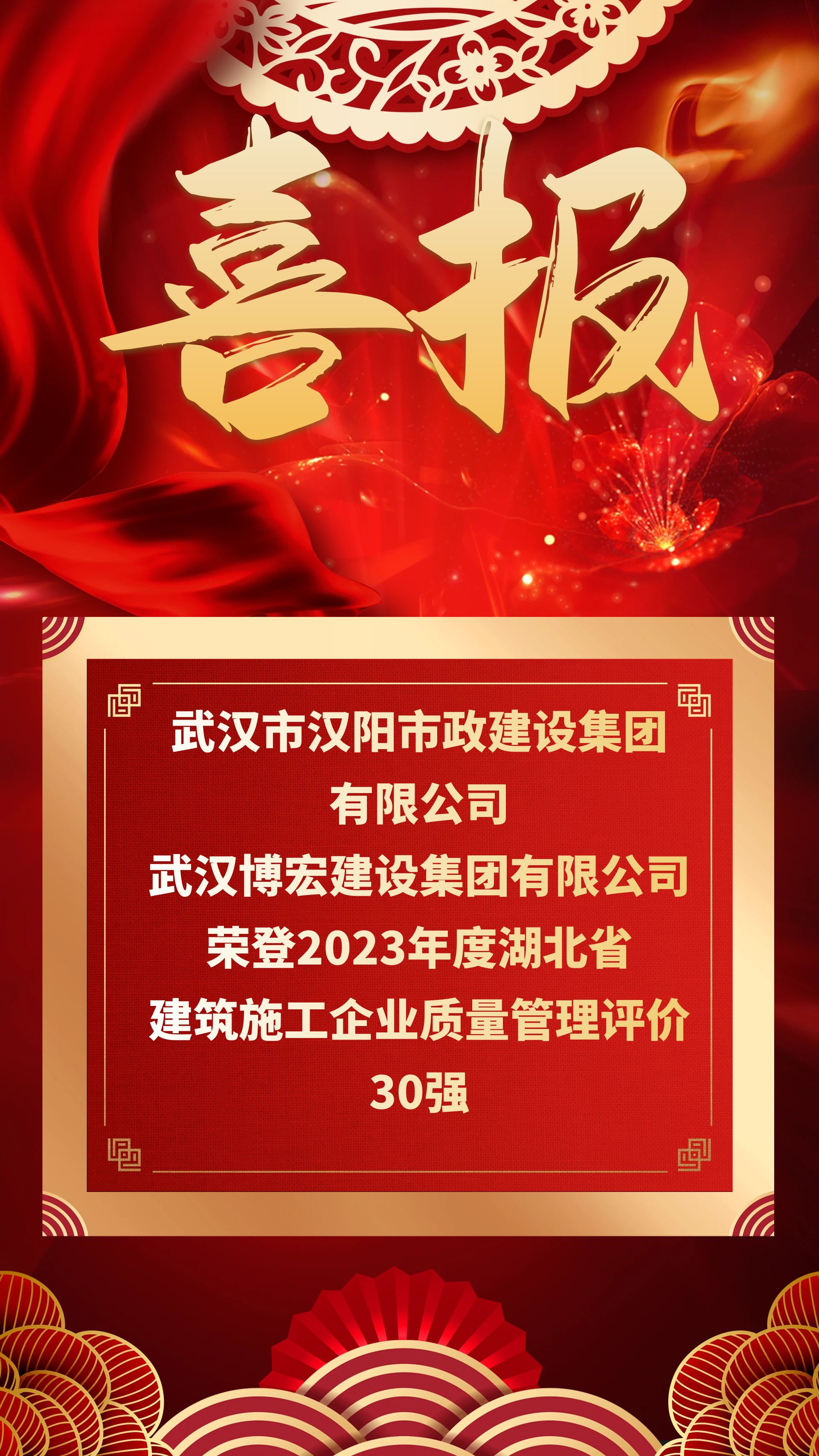 近日,湖北省建設工程質量安全協會公布2023年度湖北省建筑施工企業質量管理評價30強名單,漢陽市政及其下屬子公司博宏建設再次榮登榜單。