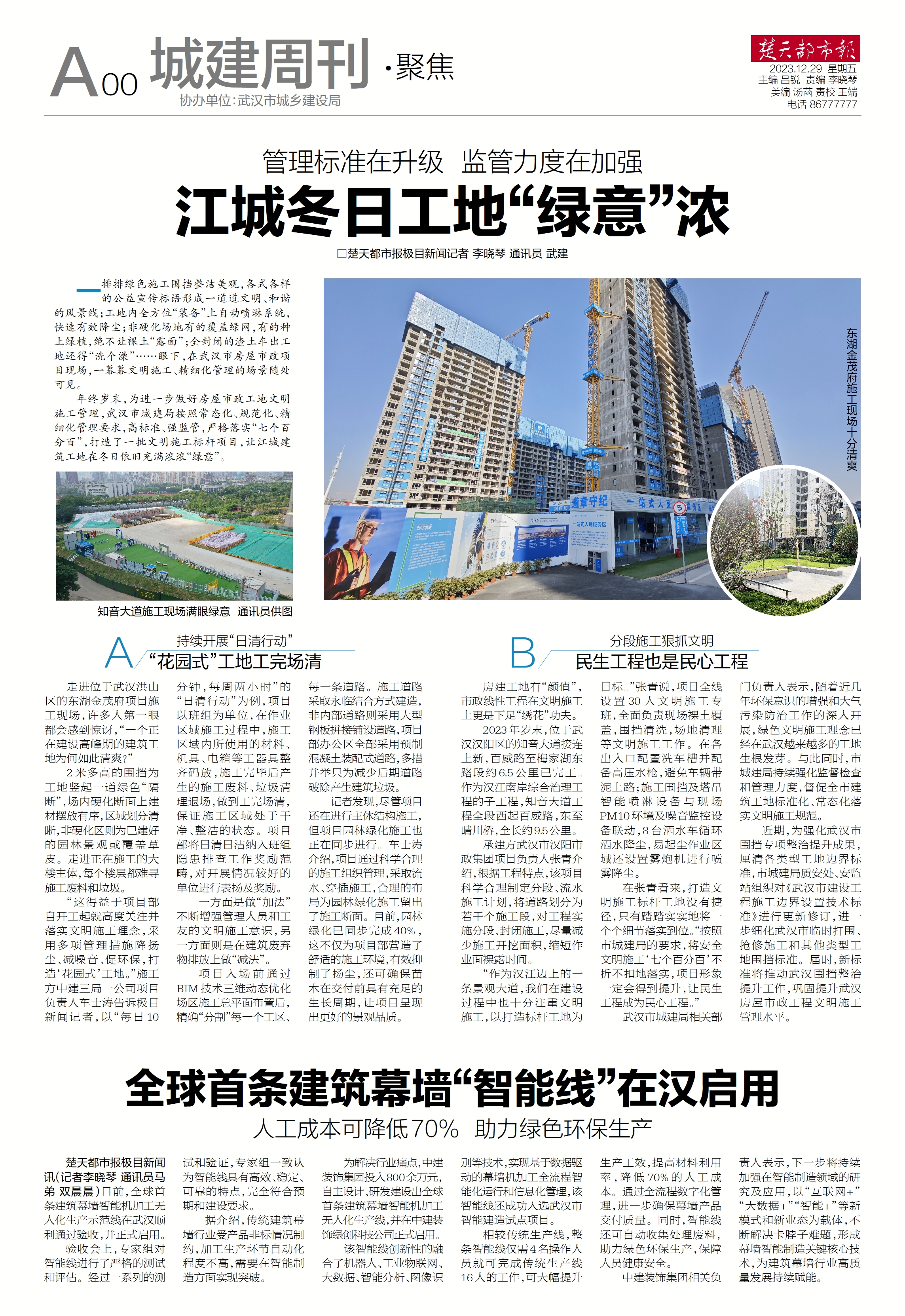 楚天都市報推出《管理標準在升級 監管力度在加強 江城冬日工地“綠意”濃》專版報道。
