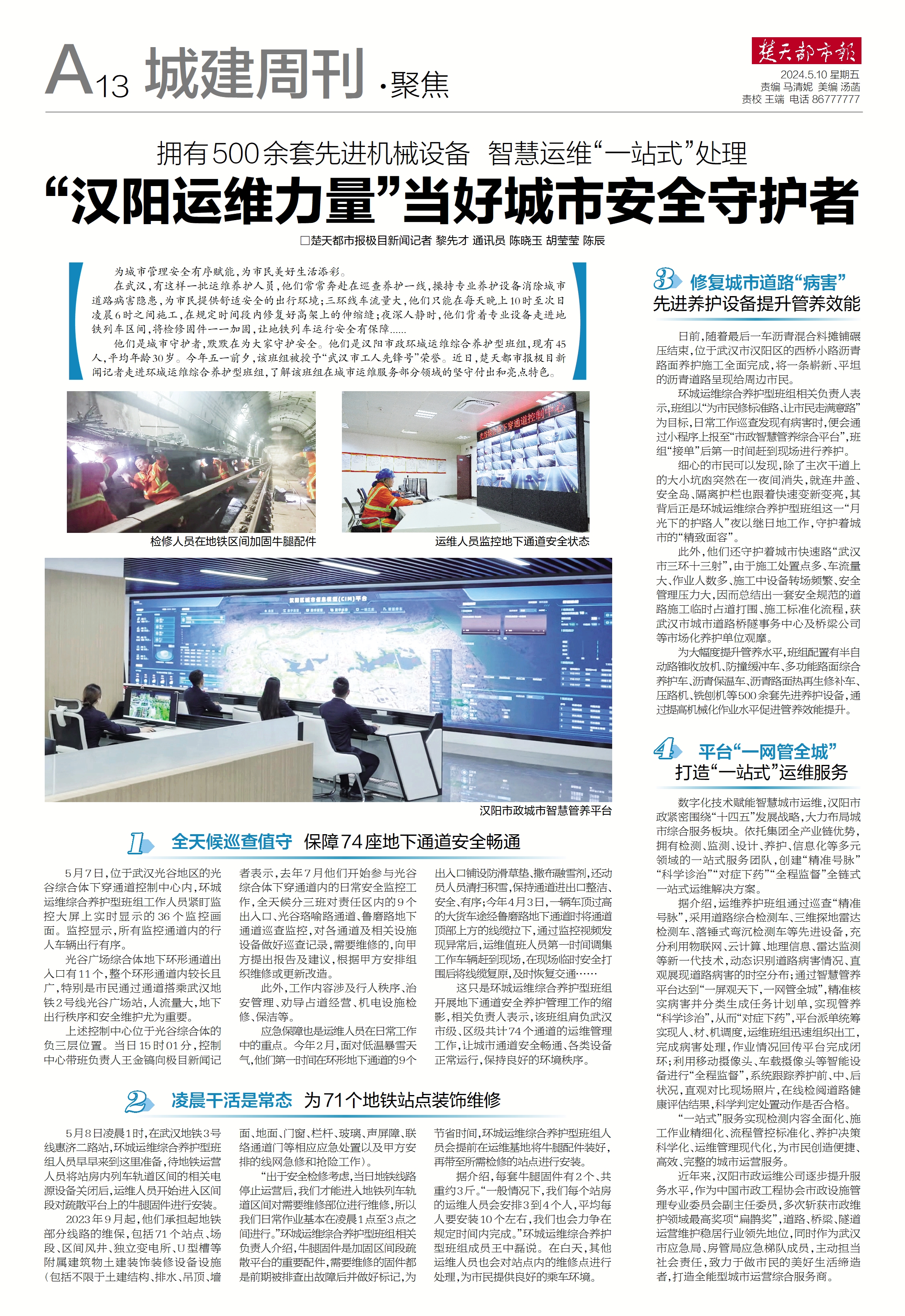 楚天都市報(bào)推出《擁有500余套先進(jìn)機(jī)械設(shè)備 智慧運(yùn)維“一站式”處理——“漢陽(yáng)運(yùn)維力量”當(dāng)好城市安全守護(hù)者》專版報(bào)道。