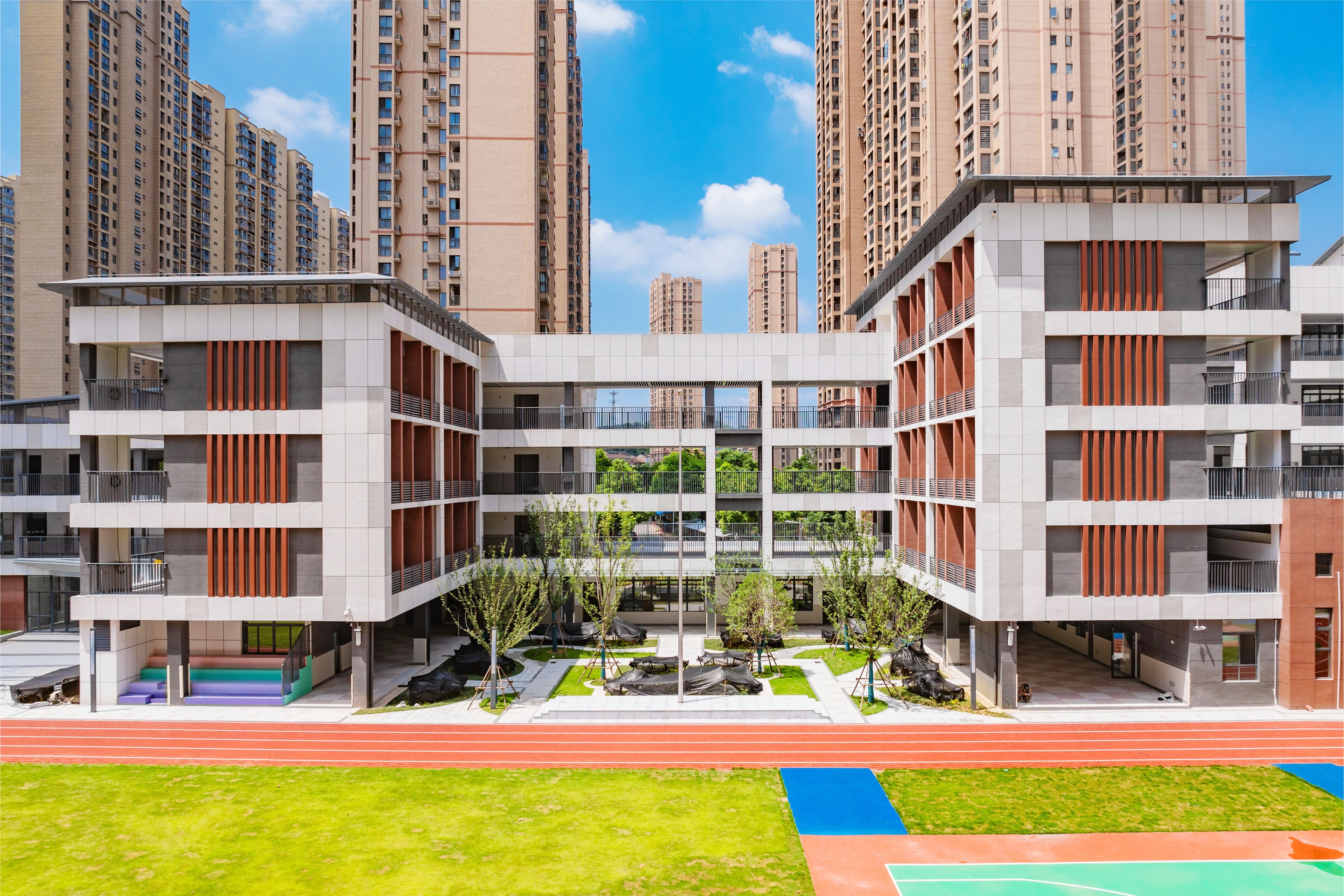 芳草小學北校區改擴建項目位于武漢市漢陽區龍陽大道與康達街交會處,緊鄰南國明珠小區,東面為芳草小學北校區老校區。建設內容包括教學用房、辦公用房、風雨操場、食堂等。學校建筑、基礎設施和教育教學設備均按照標準化、科學化、現代化的要求建設和配備,滿足了學生德智體美勞全面發展的需求。校區內苗木種類多,綠化覆蓋率廣,提供了良好的環境,利于師生課間活動。項目建成后將在一定程度上緩解學校教學設施不足、區域教育資源緊張的現狀。
